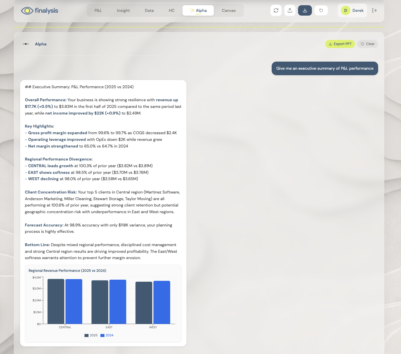 This is where Finalysis breaks from every other analytics tool. Alpha doesn't just answer your question it packages the answer. Charts, commentary, branded slides, speaker notes. Export a full executive deck directly from the conversation.