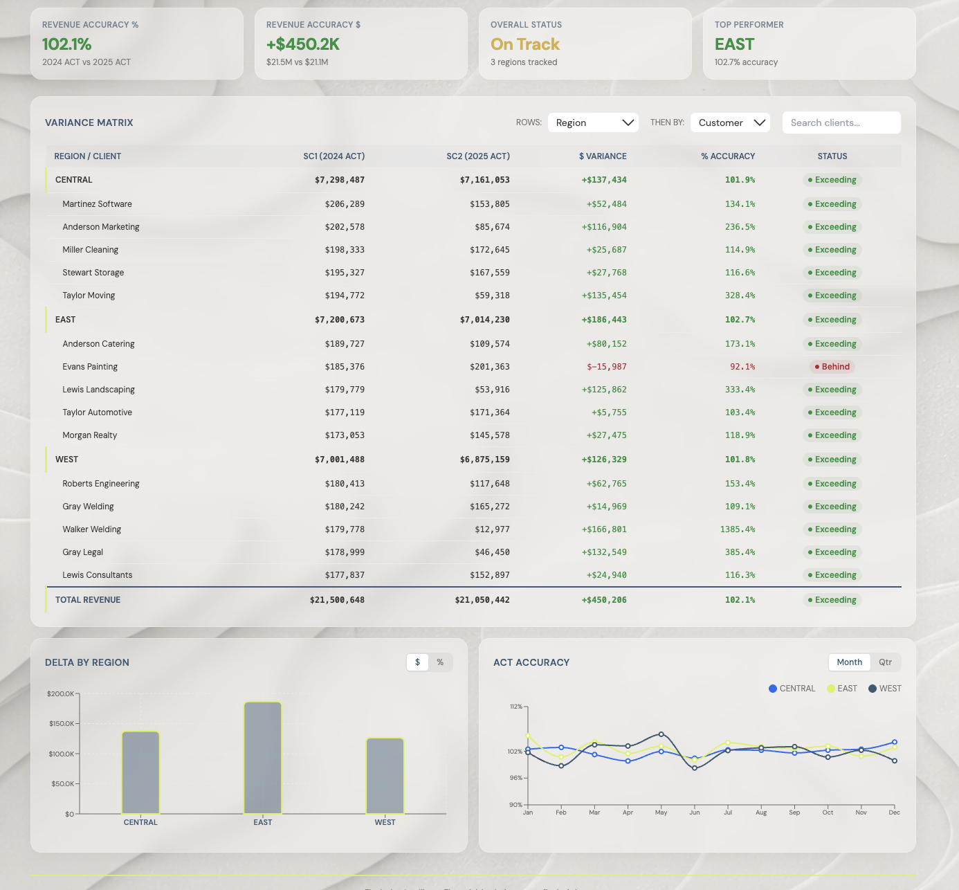 Actuals and forecasts run on the same data model. Variances are flagged the moment they appear by region, by client, by cost center. Drill into any number and trace it back to the driver. When the board call comes, the story is already written.